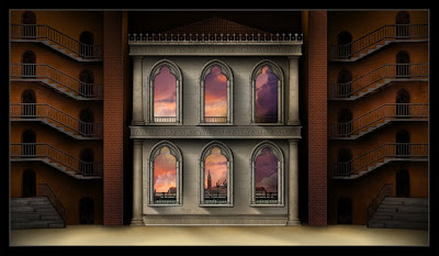 - House Shylock - The house where the greed merchant jew is officially sealed the blood pact that binds the landlord with the merchant Antonio, the protagonist of the book. The two "modules bridge" are juxtaposed with two side doors of the set forming two stairs leading into the house. The gloomy light comes from a single central window designed to illuminate only the table and the three participants to the scene ( Shylock, Antonio and Bassanio )